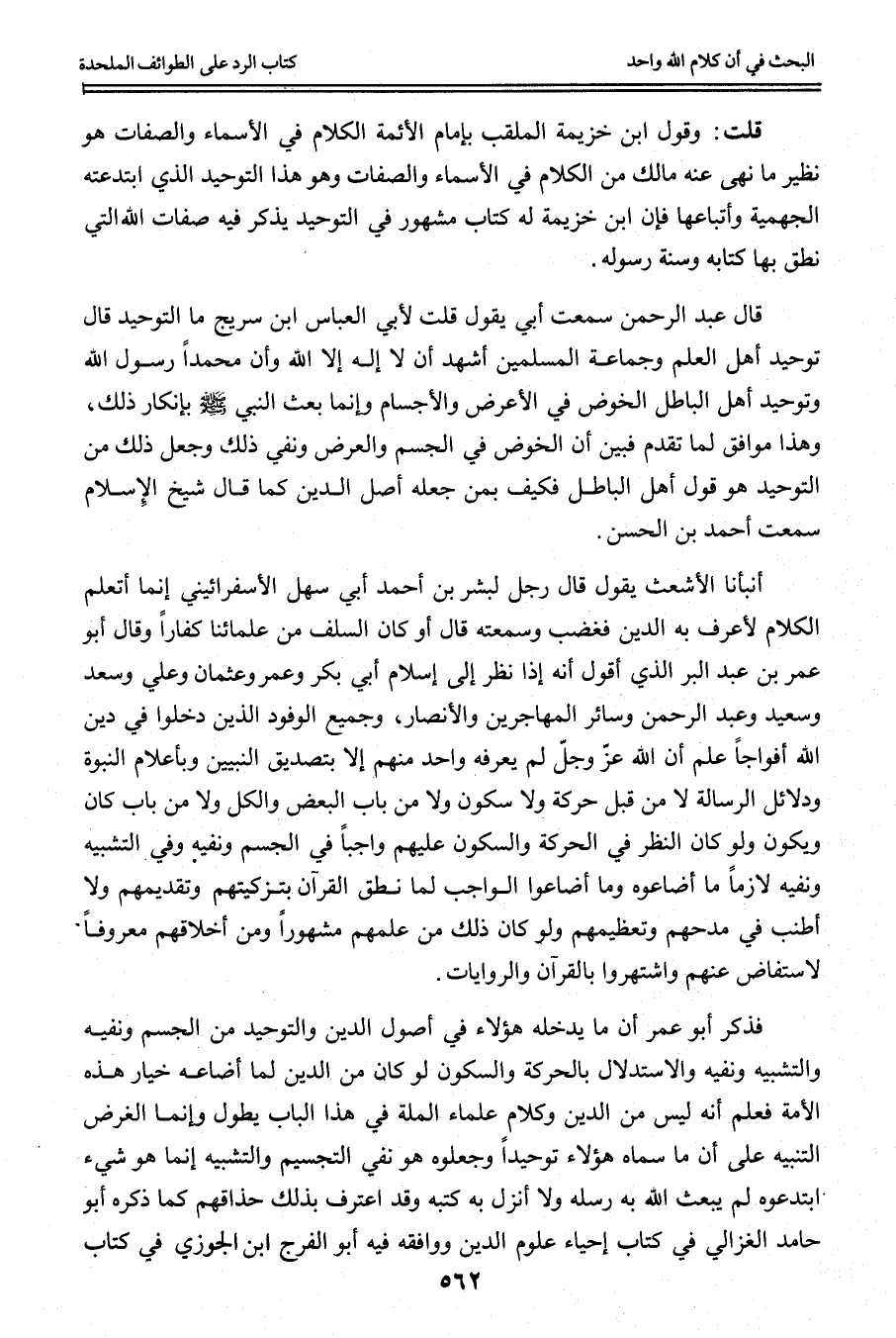 قُلْت: وَقَوْلُ ابْنِ خُزَيْمَةَ الْمُلَقَّبِ بِإِمَامِ الْأَئِمَّةِ الْكَلَامُ فِي الْأَسْمَاءِ وَالصِّفَاتِ هُوَ نَظِيرُ مَا نَهَى عَنْهُ مَالِكٌ مِنْ الْكَلَامِ فِي الْأَسْمَاءِ وَالصِّفَاتِ وَهُوَ هَذَا التَّوْحِيدُ الَّذِي ابْتَدَعَتْهُ الْجَهْمِيَّةُ وَأَتْبَاعُهَا فَإِنَّ ابْنَ خُزَيْمَةَ لَهُ كِتَابٌ مَشْهُورٌ فِي التَّوْحِيدِ يَذْكُرُ فِيهِ صِفَاتِ اللَّهِ الَّتِي نَطَقَ بِهَا كِتَابُهُ وَسُنَّةُ رَسُولِهِ.