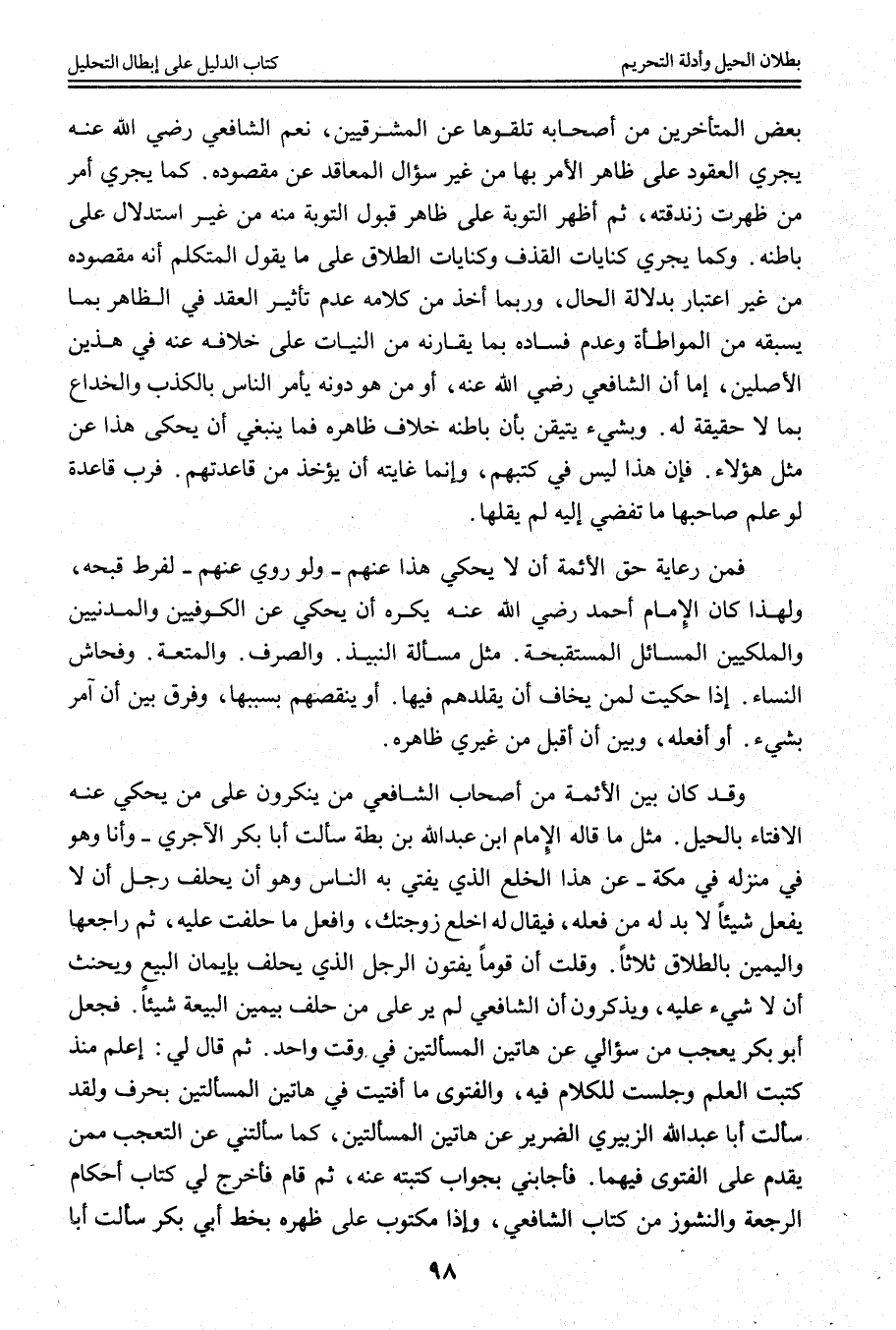 وَقَدْ كَانَ بَيْنَ الْأَئِمَّةِ مِنْ أَصْحَابِ الشَّافِعِيِّ مَنْ يُنْكِرُونَ عَلَى مَنْ يُحْكَى عَنْهُ الْإِفْتَاءُ بِالْحِيَلِ. مِثْلُ مَا قَالَهُ الْإِمَامُ ابْنُ عَبْدِ اللَّهِ ابْنُ بَطَّةَ سَأَلْت أَبَا بَكْرٍ الْآجُرِّيَّ - وَأَنَا وَهُوَ فِي مَنْزِلِهِ فِي مَكَّةَ - عَنْ هَذَا الْخُلْعِ الَّذِي يُفْتَى بِهِ النَّاسُ - وَهُوَ أَنْ يَحْلِفَ رَجُلٌ أَنْ لَا يَفْعَلَ شَيْئًا لَا بُدَّ لَهُ مِنْ فِعْلِهِ، فَيُقَالَ لَهُ: اخْلَعْ زَوْجَتَك، وَافْعَلْ مَا حَلَفْت عَلَيْهِ، ثُمَّ رَاجِعْهَا -، وَالْيَمِينِ بِالطَّلَاقِ ثَلَاثًا.