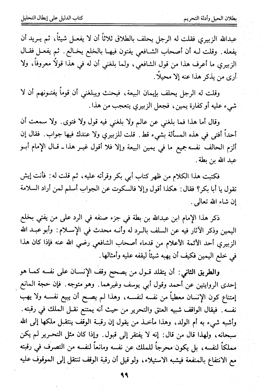 ذَكَرَ هَذَا الْإِمَامُ ابْنُ عَبْدِ اللَّهِ ابْنُ بَطَّةَ فِي جُزْءٍ صَنَّفَهُ فِي الرَّدِّ عَلَى مَنْ يُفْتِي بِخُلْعِ الْيَمِينِ وَذَكَرَ الْآثَارَ فِيهِ عَنْ السَّلَفِ بِالرَّدِّ لَهُ وَأَنَّهُ مُحْدَثٌ فِي الْإِسْلَامِ: وَأَبُو عَبْدِ اللَّهِ الزُّبَيْرِيُّ أَحَدُ الْأَئِمَّةِ الْأَعْلَامِ مِنْ قُدَمَاءِ أَصْحَابِ الشَّافِعِيِّ - رَضِيَ اللَّهُ عَنْهُ - فَإِذَا كَانَ هَذَا فِي خُلْعِ الْيَمِينِ فَكَيْفَ أَنْ يَهَبَهُ شَيْئًا لِيَقِفَهُ عَلَيْهِ وَأَمْثَالُهَا.