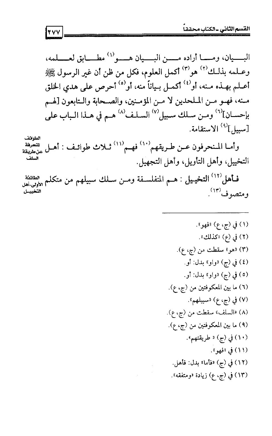 وأما المنحرفون عن طريقهم فهم ثلاث طوائف: أهل التخييل، وأهل التأويل، وأهل التجهيل.