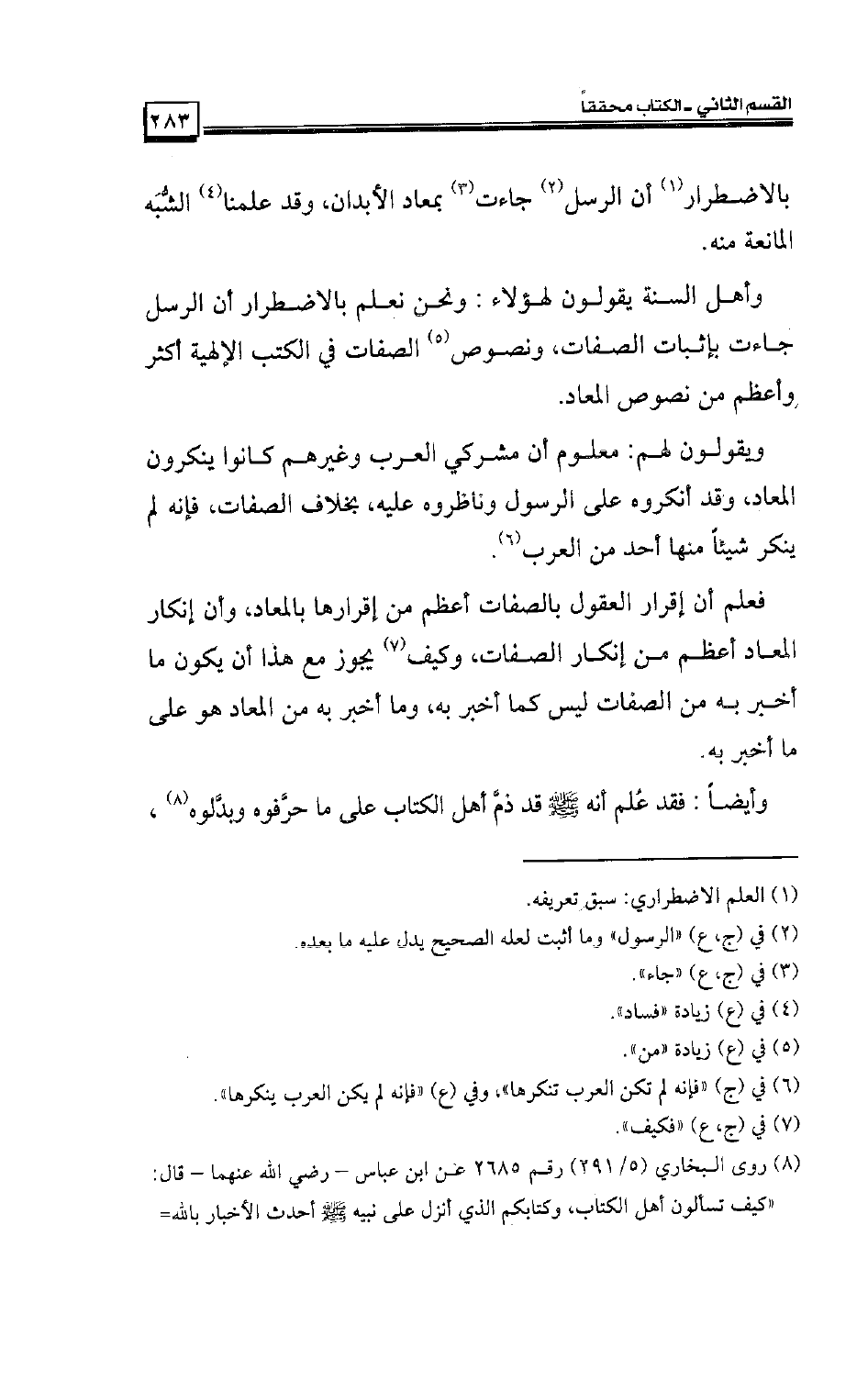 وأهل السنة يقولون لهؤلاء: ونحن نعلم بالاضطرار أن الرسل جاءت بإثبات الصفات، ونصوص الصفات في الكتب الإلهية أكثر وأعظم من نصوص المعاد.