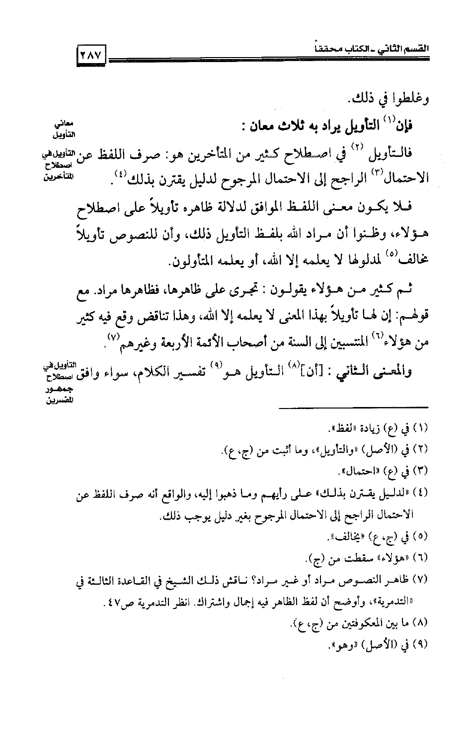 فلا يكون معنى اللفظ الموافق لدلالة ظاهره تأويلًا على اصطلاح هؤلاء، وظنوا أن مراد الله بلفظ التأويل ذلك، وأن للنصوص تأويلًا مخالف لمدلولها لا يعلمه إلا الله، أو يعلمه المتأولون.