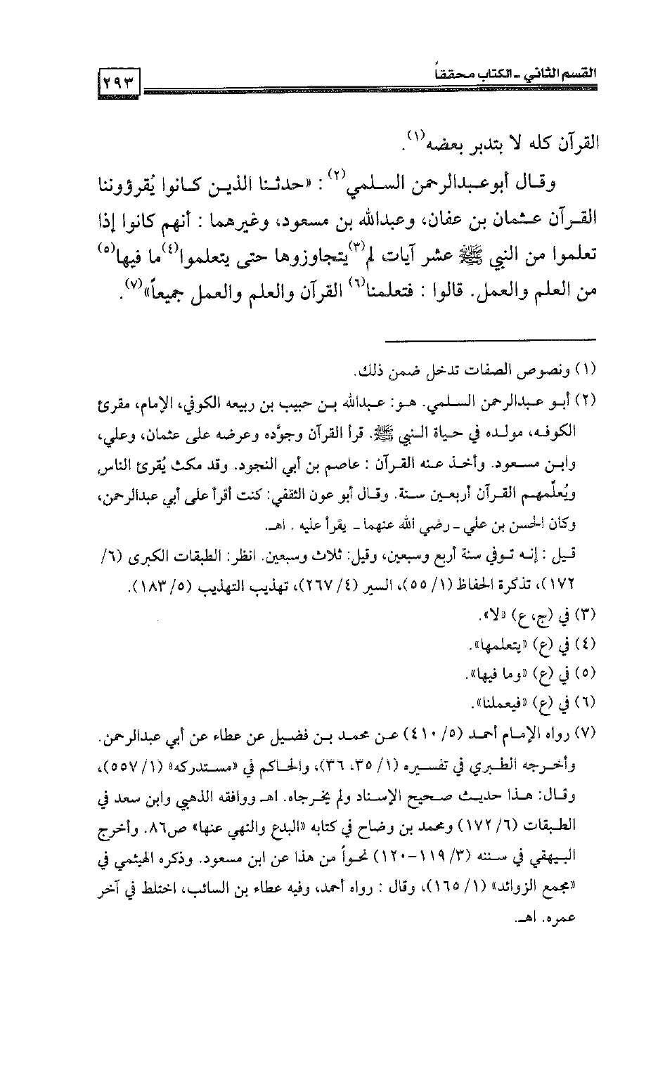 وقال أبو عبد الرحمن السلمي: «حدثنا الذين كانوا يُقرؤوننا القرآن عثمان بن عفان، وعبد الله بن مسعود، وغيرهما: أنهم كانوا إذا تعلموا من النبي صلى الله عليه وسلم عشر آيات لم يتجاوزوها حتى يتعلموا ما فيها من العلم والعمل. قالوا: فتعلمنا القرآن والعلم والعمل جميعًا» .