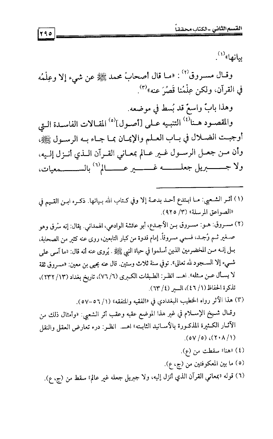 وقال مسروق: «ما قال أصحابُ محمد صلى الله عليه وسلم عن شيء إلا وعِلْمُه في القرآن، ولكن عِلْمُنا قَصُرَ عنه» .
