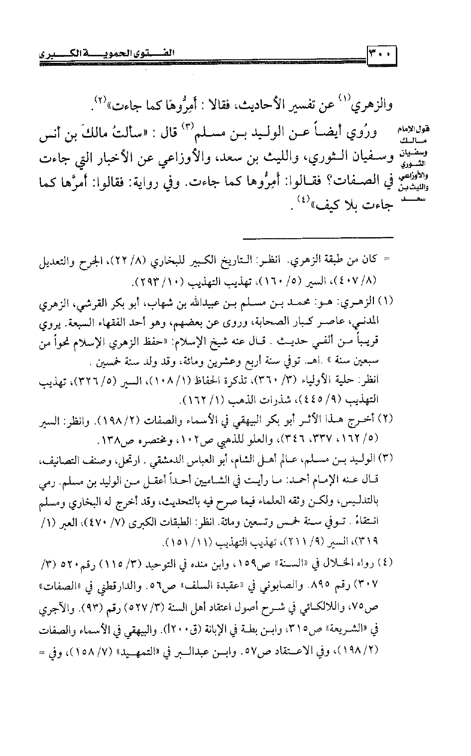 ورُوي أيضًا عن الوليد بن مسلم قال: «سألتُ مالكَ بن أنس، وسفيان الثوري، والليث بن سعد، والأوزاعي عن الأخبار التي جاءت في الصفات؟ فقالوا: أمِرُّوها كما جاءت. وفي رواية: فقالوا: أمِرَّها كما جاءت بلا كيف» .