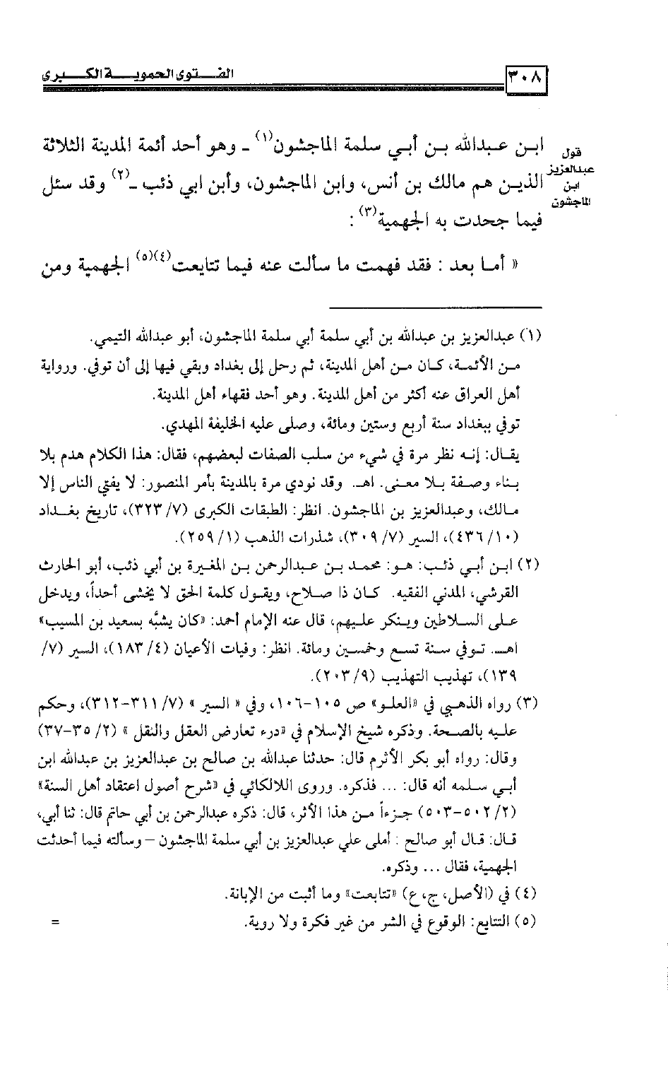 بن عبد الله بن أبي سلمة الماجشون ـ وهو أحد أئمة المدينة الثلاثة الذين هم مالك بن أنس، وابن الماجشون، وابن أبي ذئب ـ وقد سئل فيما جحدت به الجهمية:
