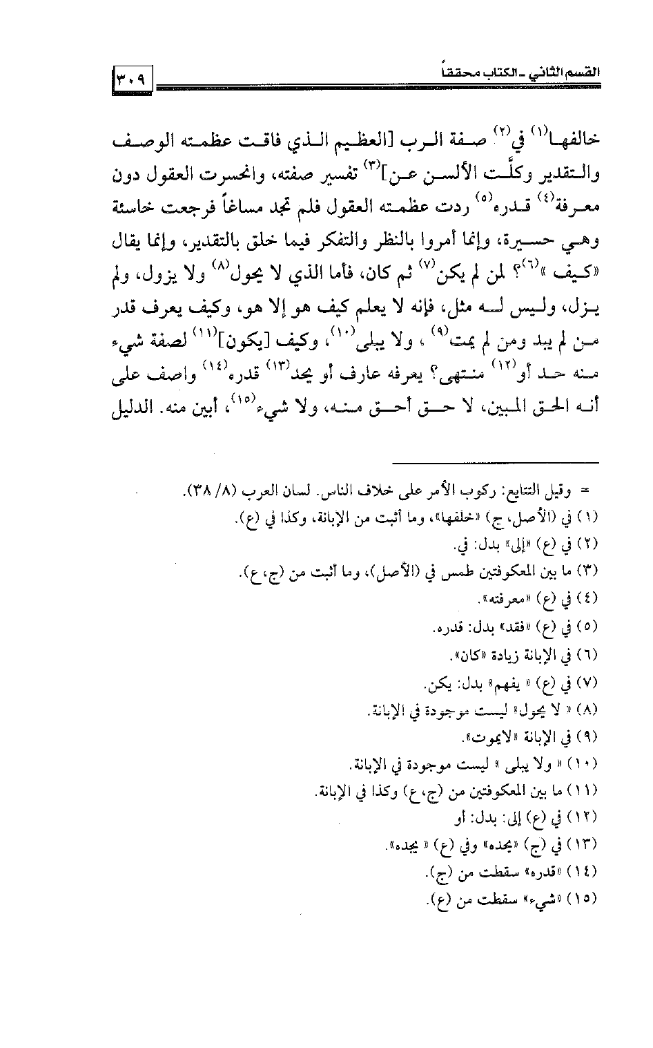 خالفها في صفة الرب [العظيم الذي فاقت عظمته الوصف والتقدير وكَلَّت الألسن عن] تفسير صفته، وانحسرت العقول دون معرفة قدره ردت عظمته العقول فلم تجد مساغًا فرجعت خاسئة وهي حسيرة، وإنما أُمروا بالنظر والتفكر فيما خلق بالتقدير، وإنما يقال «كيف» ؟ لمن لم يكن ثم كان، فأما الذي لا يحول ولا يزول، ولم يَزَلْ، وليس له مثل، فإنه لا يعلم كيف هو إلا هو، وكيف يعرف قدر من لم يبد ومن لم يمت، ولا يبلى، وكيف [يكون] لصفة شيء منه حد أو منتهى؟ يعرفه عارف أو يحد قدره واصف على أنه الحق المبين، لا حق أحق منه، ولا شيء، أبين منه. الدليل