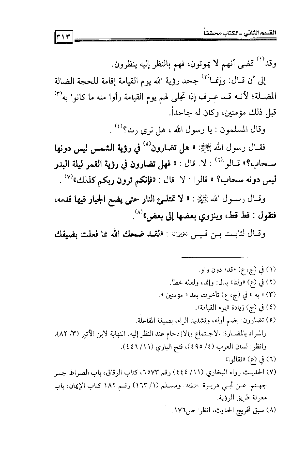 فقال رسول الله صلى الله عليه وسلم: «هل تُضَارُّون في رؤية الشمس ليس دونها سحاب؟» قالوا: لا. قال: «فهل تضارون في رؤية القمر ليلة البدر ليس دونه سحاب؟» قالوا: لا. قال: «فإنكم ترون ربكم كذلك» .