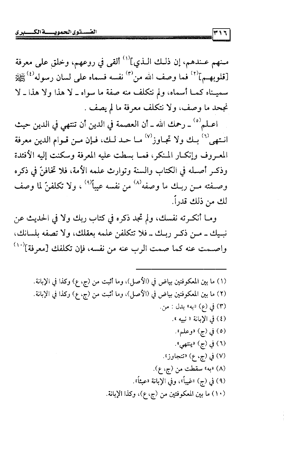 اعلم ـ رحمك الله ـ أن العصمة في الدين أن تنتهي في الدين حيث انتهي بك ولا تجاوز ما حد لك، فإن من قوام الدين معرفة المعروف وإنكار المنكر، فما بسطت عليه المعرفة وسكنت إليه الأفئدة وذكر أصله في الكتاب والسنة وتوارث علمه الأمة، فلا تخافنّ في ذكره وصفته من ربك ما وصفه من نفسه عيبًا، ولا تتكلفنّ لما وصف لك من ذلك قدرًا.