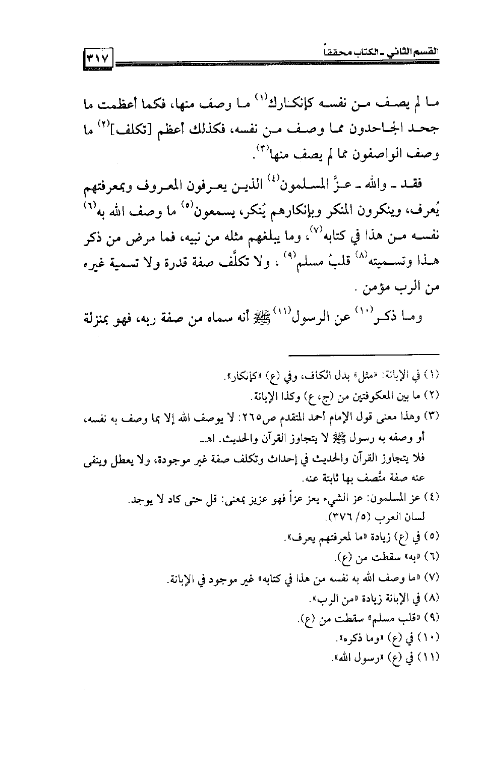 فقد ـ والله ـ عَزّ المسلمون الذين يعرفون المعروف وبمعرفتهم يُعرف، وينكرون المنكر وبإنكارهم يُنكر، يسمعون ما وصف الله به نفسه من هذا في كتابه، وما بلغهم مثله من نبيه، فما مرض من ذكر هذا وتسميته قلبُ مسلم، ولا تكلَّف صفة قدرة ولا تسمية غيره من الرب مؤمن.