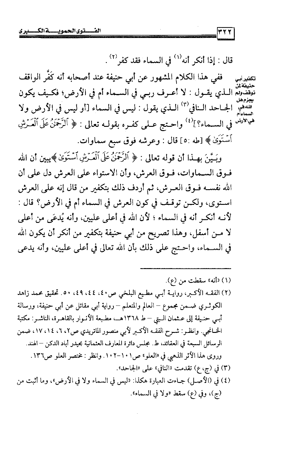 وبَيَّنَ بهذا أن قوله تعالى: {الرَّحْمَنُ عَلَى الْعَرْشِ اسْتَوَى} يبين أن الله فوق السماوات، فوق العرش، وأن الاستواء على العرش دل على أن الله نفسه فوق العرش، ثم أردف ذلك بتكفير من قال إنه على العرش استوى، ولكن توقف في كون العرش في السماء أم في الأرض؟ قال: لأنه أنكر أنه في السماء؛ لأن الله في أعلى عليين، وأنه يُدعَى من أعلى لا من أسفل، وهذا تصريح من أبي حنيفة بتكفير من أنكر أن يكون الله في السماء، واحتج على ذلك بأن الله تعالى في أعلى عليين، وأنه يدعى