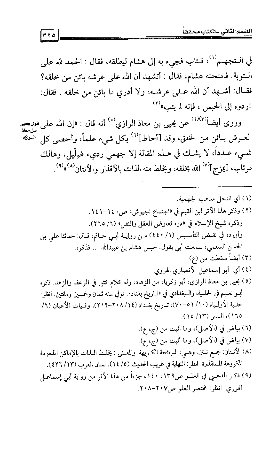 وروى أيضًا عن يحيى بن معاذ الرازي أنه قال: «إن الله على العرش بائن من الخلق، وقد [أحاط] بكل شيء علمًا، وأحصى كل شيء عددًا، لا يشك في هذه المقالة إلا جهمي رديء ضِلّيل، وهالك مرتاب، [يمزج] الله بخلقه، ويخلط منه الذات بالأقذار والأنتان» .