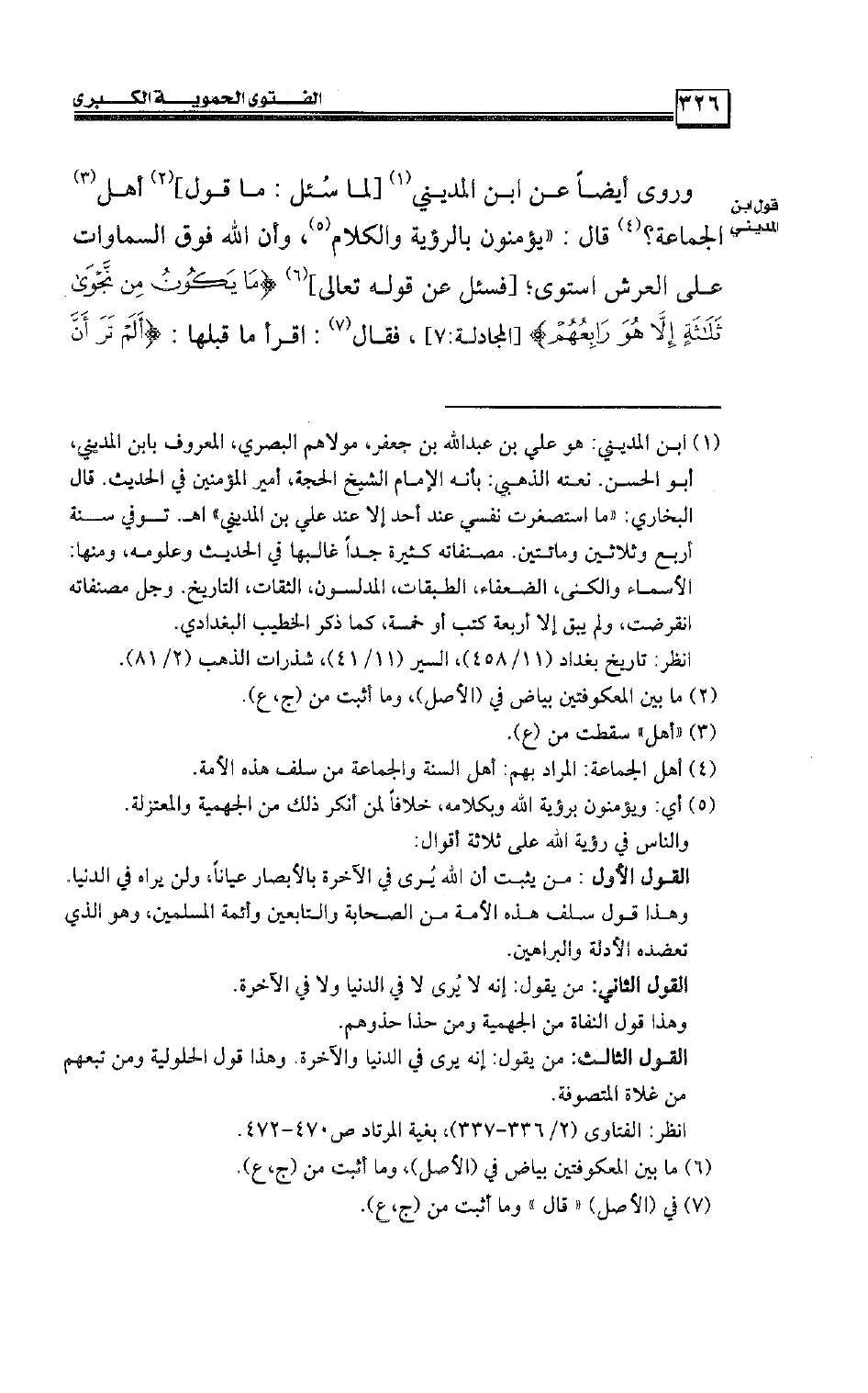 وروى أيضًا عن ابن المدينى [لما سُئل: ما قول] أهل الجماعة؟ قال: «يؤمنون بالرؤية والكلام، وأن الله فوق السماوات على العرش استوى؛ [فسئل عن قوله تعالى] {مَا يَكُونُ مِن نَّجْوَى ثَلَاثَةٍ إِلَّا هُوَ رَابِعُهُمْ} [المجادلة:7] ، فقال: اقرأ ما قبلها: {أَلَمْ تَرَ أَنَّ