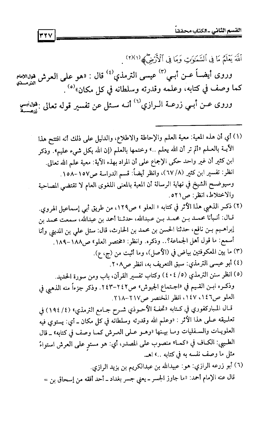 وروى أيضًا عن أبي عيسى الترمذي قال: «هو على العرش كما وصف في كتابه، وعلمه وقدرته وسلطانه في كل مكان» .
