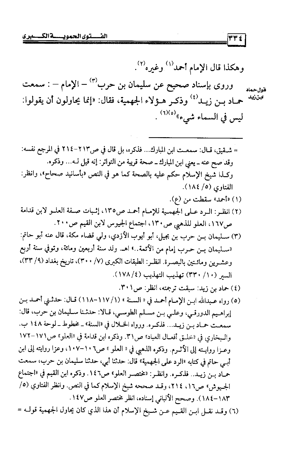 وروى بإسناد صحيح عن سليمان بن حرب ـ الإمام ـ: سمعت حماد بن زيد وذكر هؤلاء الجهمية، فقال: «إنما يحاولون أن يقولوا: ليس في السماء شيء» .