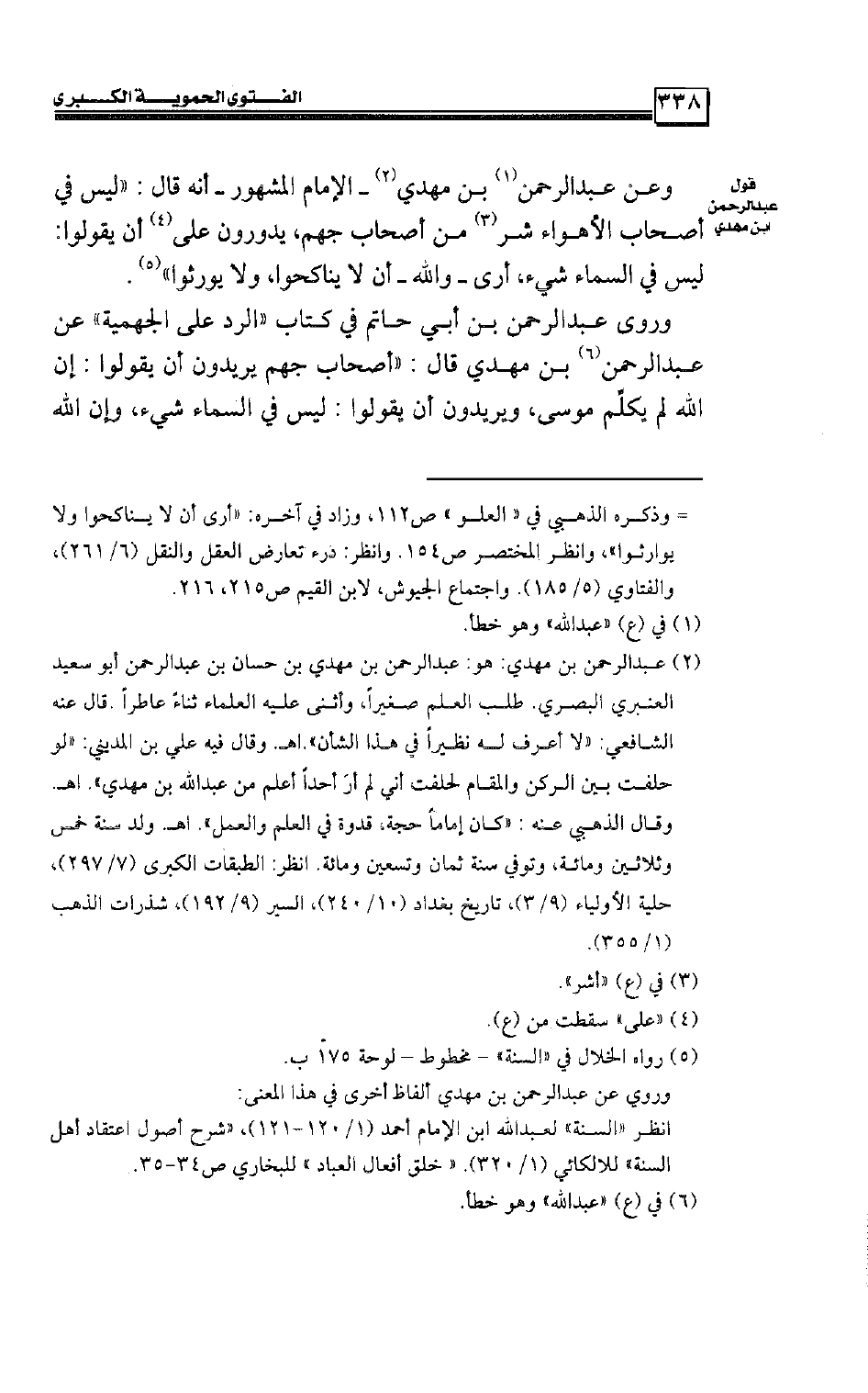 وعن عبد الرحمن بن مهدي ـ الإمام المشهور ـ أنه قال: «ليس في أصحاب الأهواء شر من أصحاب جهم، يدورون على أن يقولوا: ليس في السماء شيء، أرى ـ والله ـ أن لا يناكحوا، ولا يورثوا» .