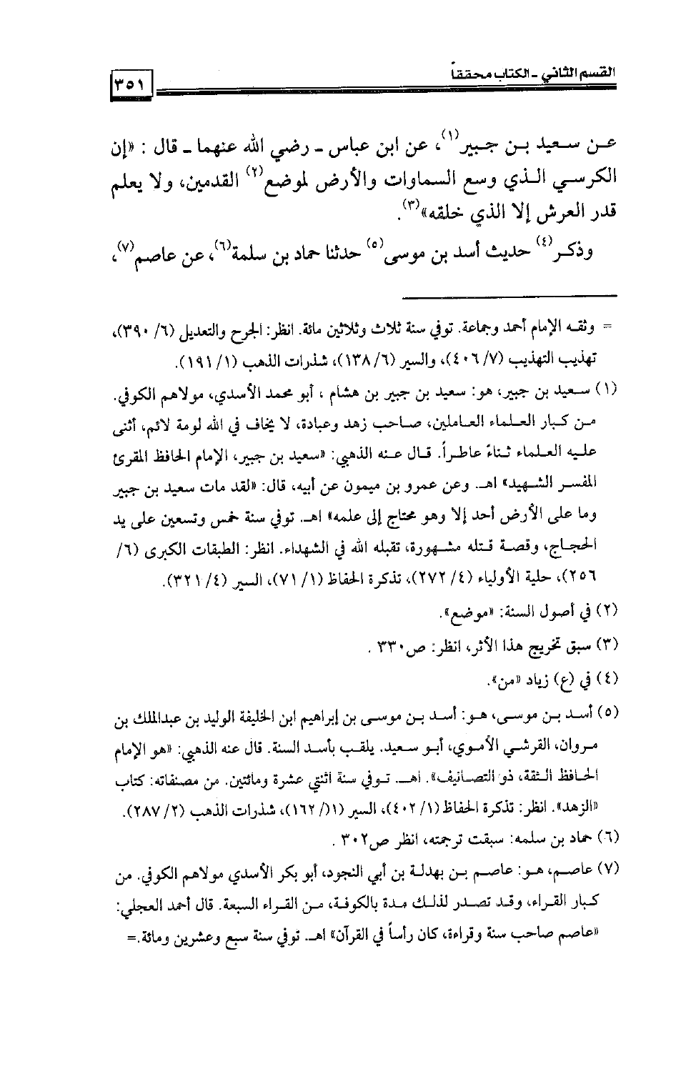 عن سعيد بن جبير، عن ابن عباس ـ رضي الله عنهما ـ قال: «إن الكرسي الذي وسع السماوات والأرض لموضع القدمين، ولا يعلم قدر العرش إلا الذي خلقه» .