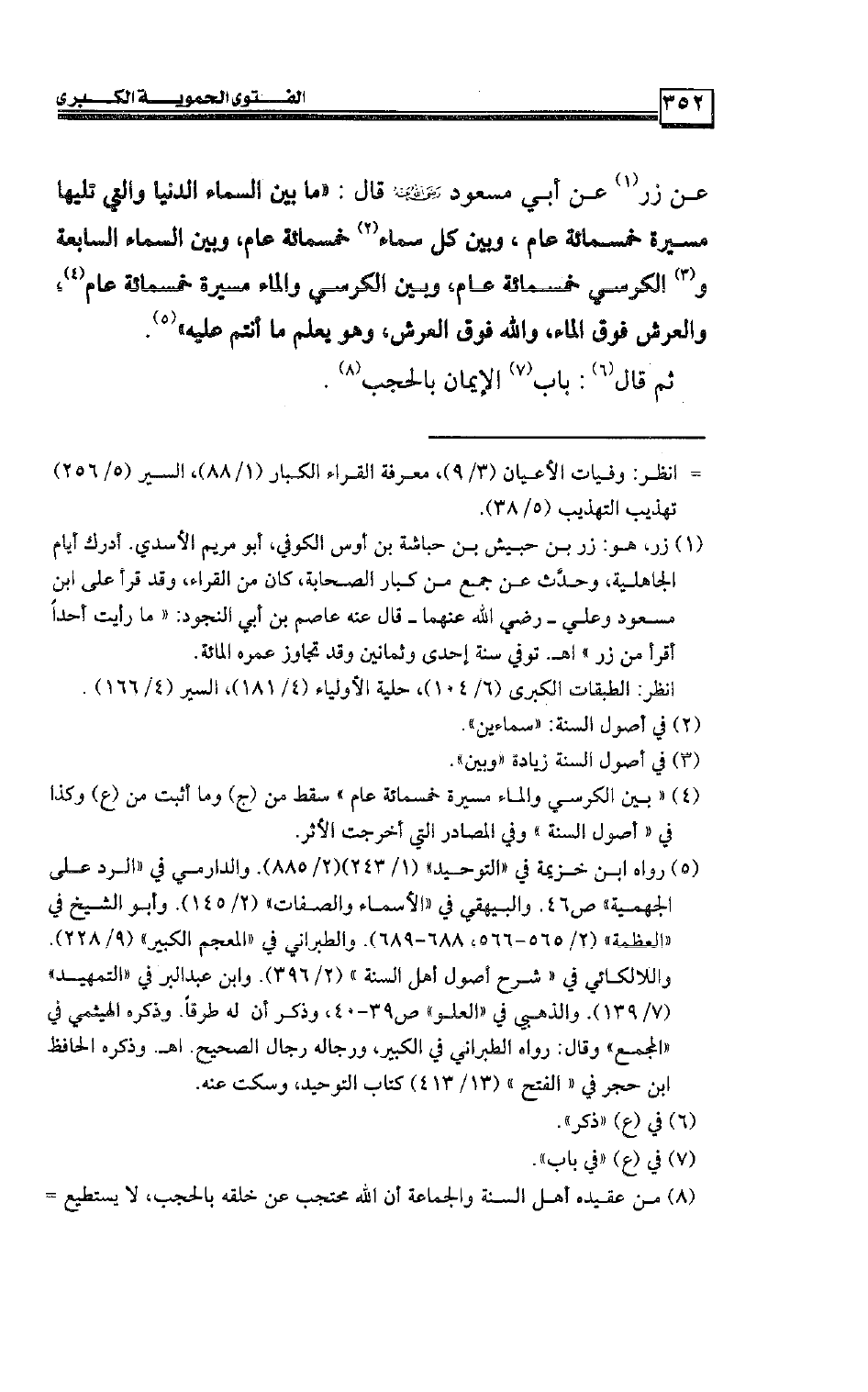 عن زر عن أبي مسعود رضي الله عنه قال: «ما بين السماء الدنيا والتي تليها مسيرة خمسمائة عام، وبين كل سماء خمسمائة عام، وبين السماء السابعة والكرسي خمسمائة عام، وبين الكرسي والماء مسيرة خمسمائة عام، والعرش فوق الماء، والله فوق العرش، وهو يعلم ما أنتم عليه» .