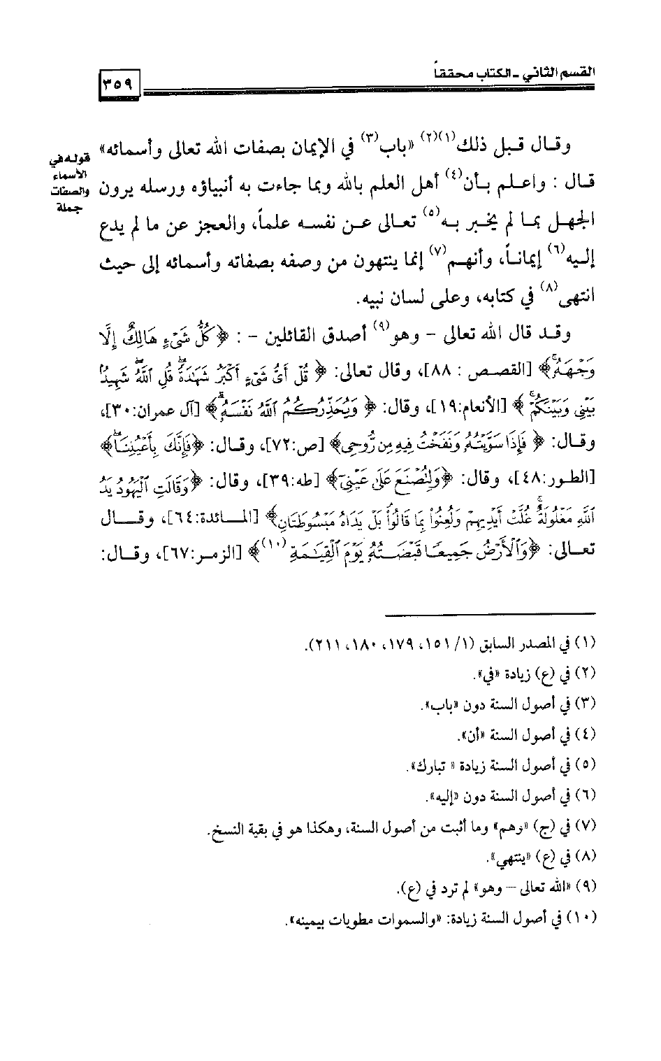 وقال قبل ذلك «باب في الإيمان بصفات الله تعالى وأسمائه» قال: واعلم بأن أهل العلم بالله وبما جاءت به أنبياؤه ورسله يرون الجهل بما لم يخبر به تعالى عن نفسه علمًا، والعجز عن ما لم يدع إليه إيمانًا، وأنهم إنما ينتهون من وصفه بصفاته وأسمائه إلى حيث انتهى في كتابه، وعلى لسان نبيه.