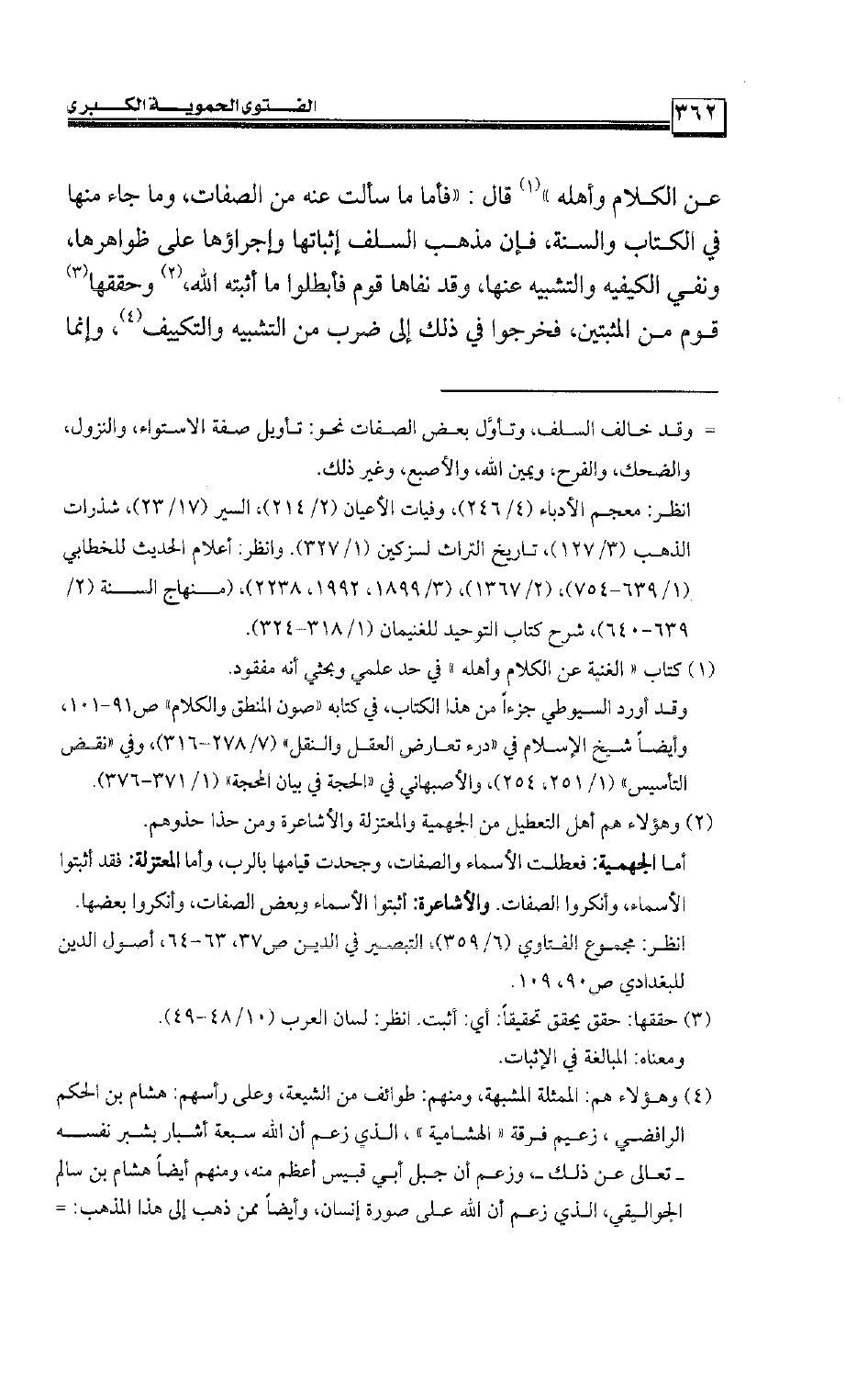 عن الكلام وأهله» قال: «فأما ما سألت عنه من الصفات، وما جاء منها في الكتاب والسنة، فإن مذهب السلف إثباتها وإجراؤها على ظواهرها، ونفي الكيفية والتشبيه عنها، وقد نفاها قوم فأبطلوا ما أثبته الله، وحققها قوم من المثبتين، فخرجوا في ذلك إلى ضرب من التشبيه والتكييف، وإنما