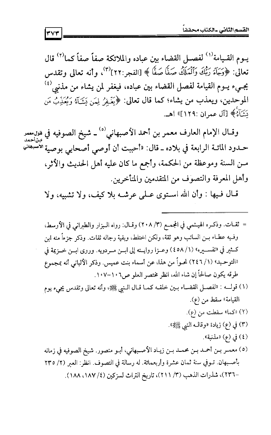 وقال الإمام العارف معمر بن أحمد الأصبهاني ـ شيخ الصوفية في حدود المائة الرابعة في بلاده ـ قال: «أحببت أن أوصي أصحابي بوصية من السنة وموعظة من الحكمة، وأجمع ما كان عليه أهل الحديث والأثر، وأهل المعرفة والتصوف من المتقدمين والمتأخرين.