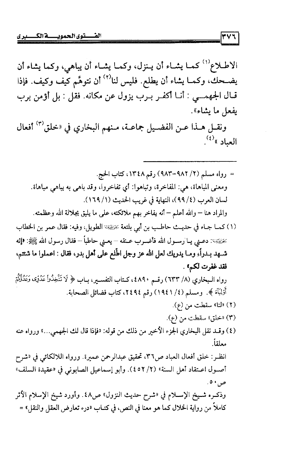 الاطلاع كما يشاء أن ينزل، وكما يشاء أن يباهي، وكما يشاء أن يضحك، وكما يشاء أن يطلع. فليس لنا أن نتوهَّم كيف وكيف. فإذا قال الجهمي: أنا أكفر برب يزول عن مكانه. فقل: بل أؤمن برب يفعل ما يشاء» .