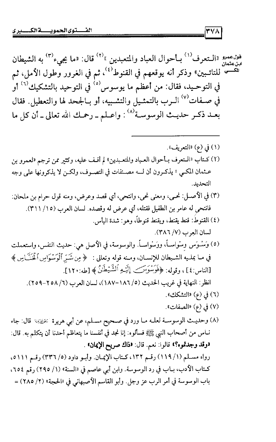 «التعرف بأحوال العباد والمتعبدين» قال: «ما يجيء به الشيطان للتائبين» وذكر أنه يوقعهم في القنوط، ثم في الغرور وطول الأمل، ثم في التوحيد، فقال: من أعظم ما يوسوس في التوحيد بالتشكيك أو في صفات الرب بالتمثيل والتشبيه، أو بالجحد لها والتعطيل. فقال بعد ذكر حديث الوسوسة: واعلم ـ رحمك الله تعالى ـ أن كُلَّ ما