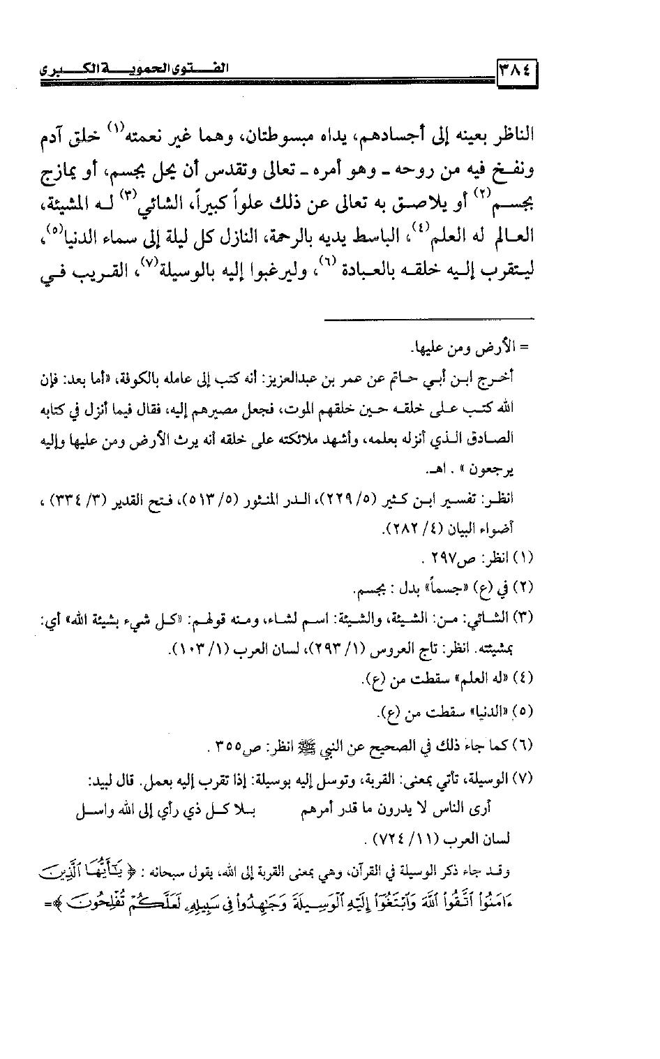 الناظر بعينه إلى أجسادهم، يداه مبسوطتان، وهما غير نعمته خلق آدم ونفخ فيه من روحه ـ وهو أمره ـ تعالى وتقدس أن يحل بجسم، أو يمازج بجسم أو يلاصق به تعالى عن ذلك علوًا كبيرًا، الشائي له المشيئة، العالم له العلم، الباسط يديه بالرحمة، النازل كل ليلة إلى سماء الدنيا، ليتقرب إليه خلقه بالعبادة، وليرغبوا إليه بالوسيلة، القريب في