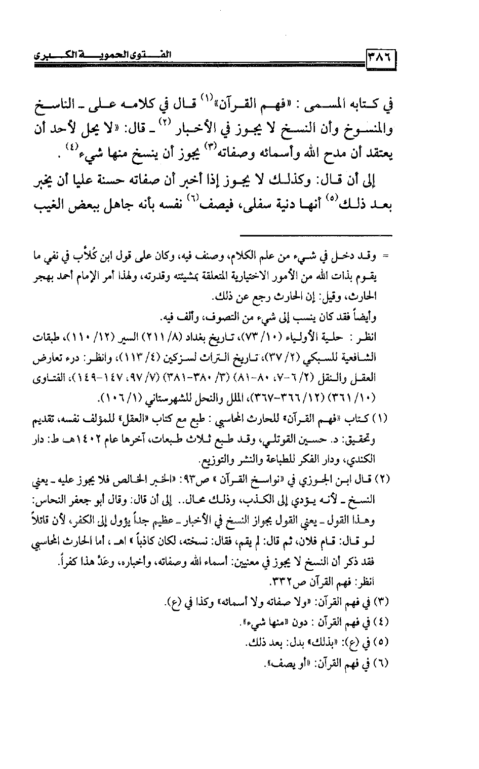 في كتابه المسمى: «فَهْم القرآن» قال في كلامه على ـ الناسخ والمنسوخ وأن النسخ لا يجوز في الأخبار ـ قال: «لا يحل لأحد أن يعتقد أن مدح الله وأسمائه وصفاته يجوز أن ينسخ منها شيء.