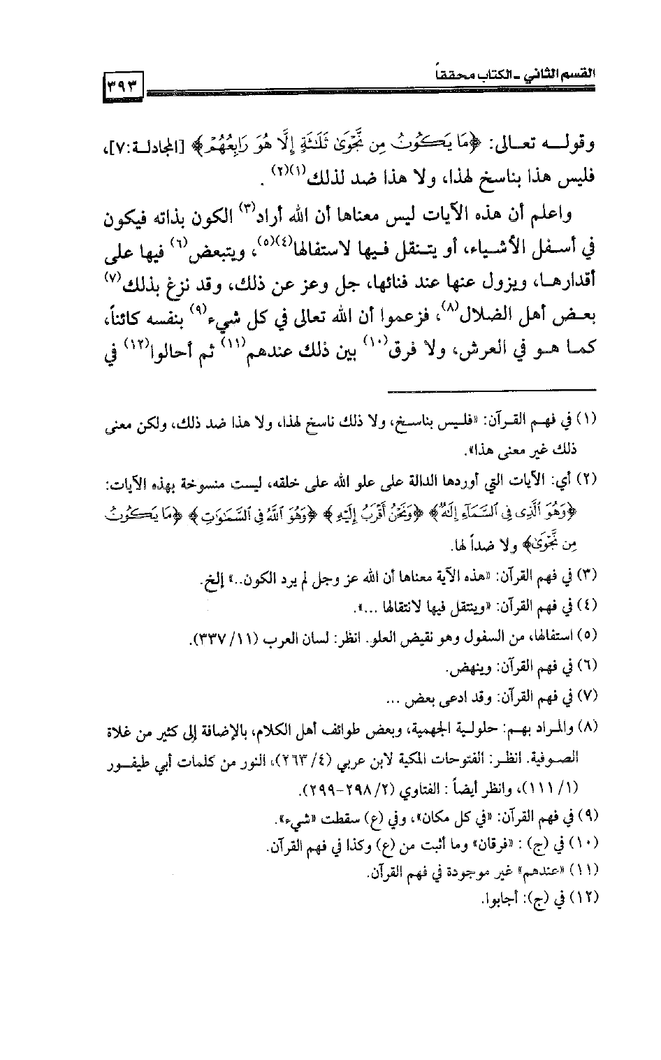 واعلم أن هذه الآيات ليس معناها أن الله أراد الكون بذاته فيكون في أسفل الأشياء، أو يتنقل فيها لاستفالها، ويتبعض فيها على أقدارها، ويزول عنها عند فنائها، جل وعز عن ذلك، وقد نزغ بذلك بعض أهل الضلال، فزعموا أن الله تعالى في كل شيء بنفسه كائنًا، كما هو في العرش، ولا فرق بين ذلك عندهم ثم أحالوا في