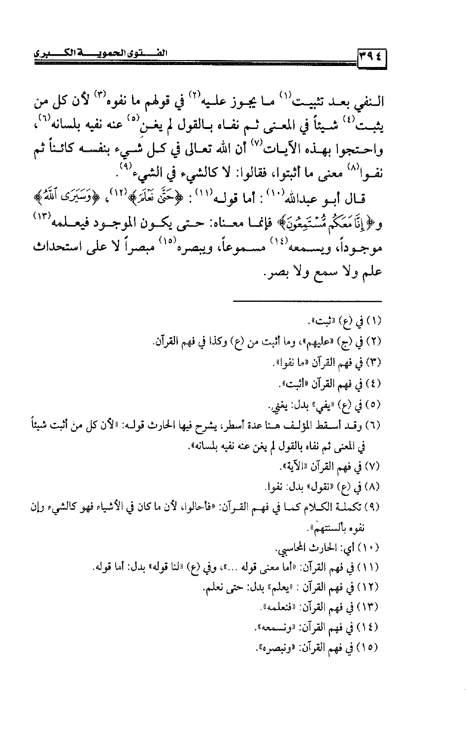 قال أبو عبد الله: أما قوله: {حَتَّى نَعْلَمَ} [محمد:31] ، {وَسَيَرَى اللهُ} و {إِنَّا مَعَكُم مُّسْتَمِعُونَ} فإنما معناه: حتى يكون الموجود فيعلمه موجودًا، ويسمعه مسموعًا، ويبصره مبصرًا لا على استحداث علم ولا سمع ولا بصر.