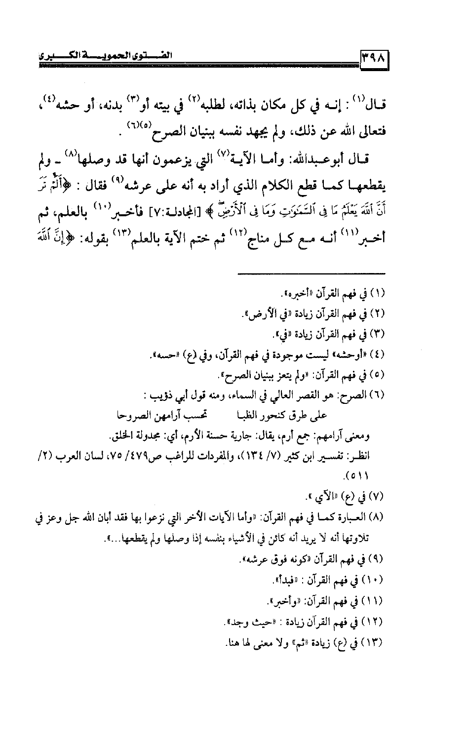 قال أبو عبد الله: وأما الآية التي يزعمون أنها قد وصلها ـ ولم يقطعها كما قطع الكلام الذي أراد به أنه على عرشه فقال: {أَلَمْ تَرَ أَنَّ اللَّهَ يَعْلَمُ مَا فِي السَّمَاوَاتِ وَمَا فِي الْأَرْضِ} [المجادلة:7] فأخبر بالعلم، ثم أخبر أنه مع كل مناج ثم ختم الآية بالعلم بقوله: {إِنَّ اللَّهَ