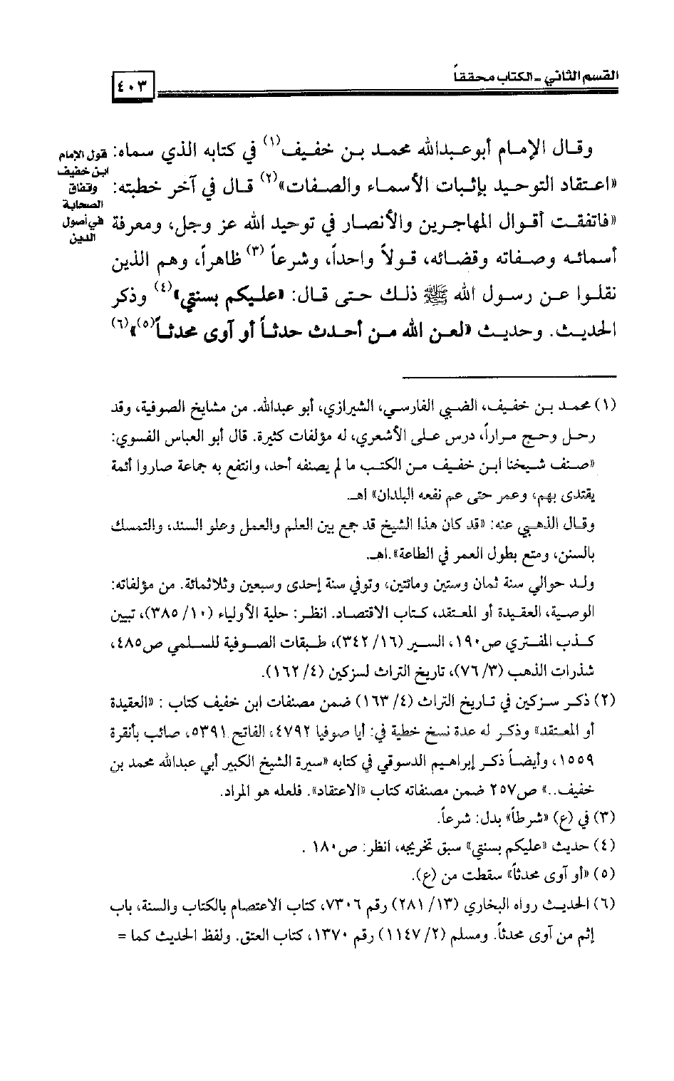 وقال الإمام أبو عبد الله محمد بن خفيف في كتابه الذي سماه: «اعتقاد التوحيد بإثبات الأسماء والصفات» ، قال في آخر خطبته: «فاتفقت أقوال المهاجرين والأنصار في توحيد الله عز وجل، ومعرفة أسمائه وصفاته وقضائه، قولاً واحدًا، وشرعًا ظاهرًا، وهم الذين نقلوا عن رسول الله صلى الله عليه وسلم ذلك حتى قال: «عليكم بسنتي» وذكر الحديث. وحديث «لعن الله من أحدث حدثًا أو آوى محدثًا»