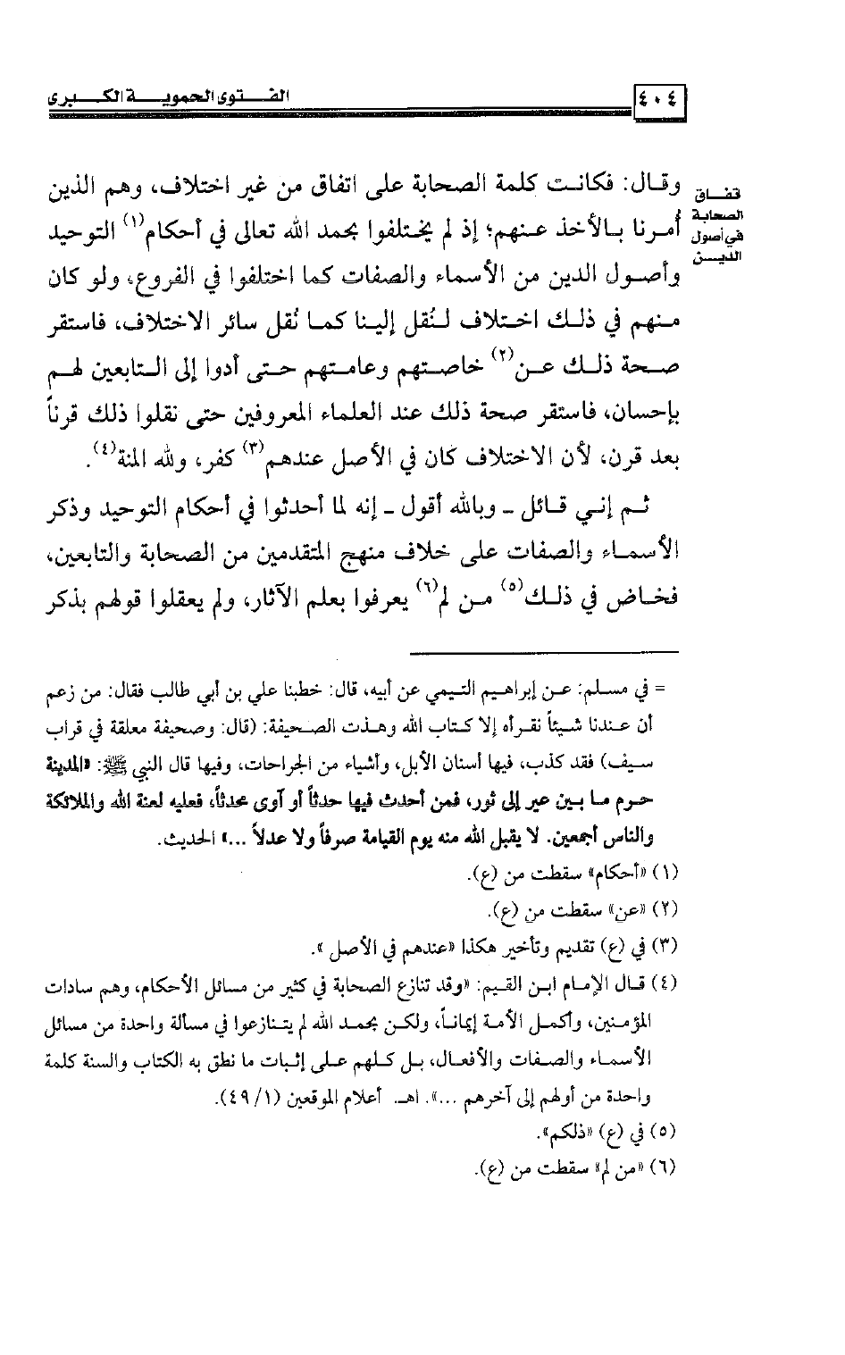 وقال: فكانت كلمة الصحابة على اتفاق من غير اختلاف، وهم الذين أُمرنا بالأخذ عنهم؛ إذ لم يختلفوا بحمد الله تعالى في أحكام التوحيد وأصول الدين من الأسماء والصفات كما اختلفوا في الفروع، ولو كان منهم في ذلك اختلاف لنُقل إلينا كما نُقل سائر الاختلاف، فاستقر صحة ذلك عن خاصتهم وعامتهم حتى أدوا إلى التابعين لهم بإحسان، فاستقر صحة ذلك عند العلماء المعروفين حتى نقلوا ذلك قرنًا بعد قرن، لأن الاختلاف كان في الأصل عندهم كفر، ولله المنة.