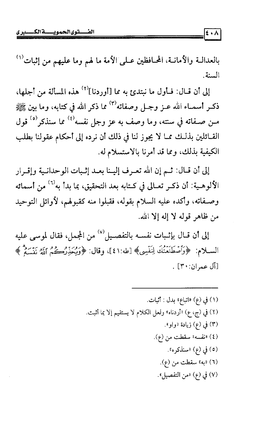 إلى أن قال بإثبات نفسه بالتفصيل من المجمل، فقال لموسى عليه السلام: {وَاصْطَنَعْتُكَ لِنَفْسِي} [طه:41] ، وقال: {وَيُحَذِّرُكُمُ اللهُ نَفْسَهُ} [آل عمران:30] .