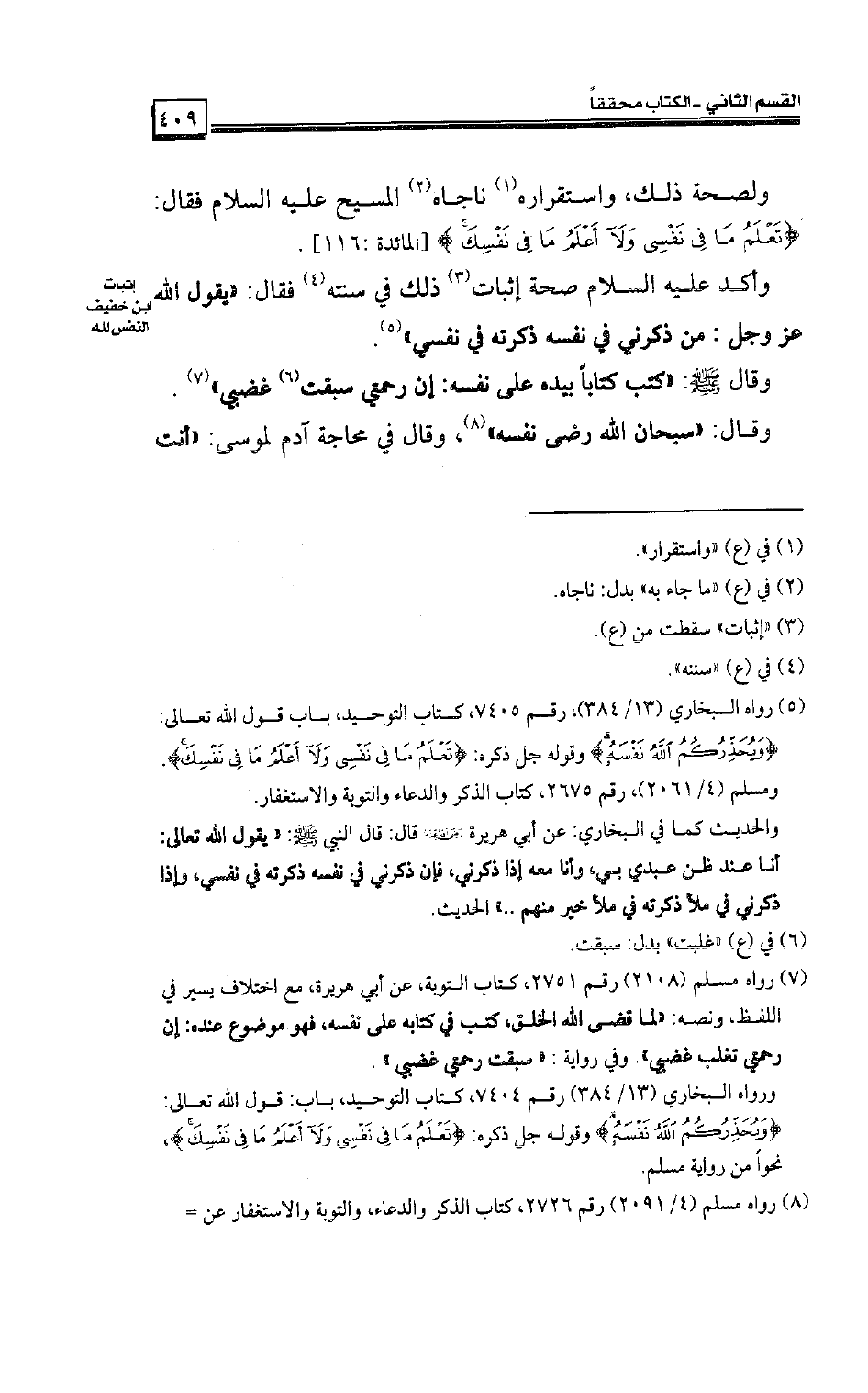 وأكد عليه السلام صحة إثبات ذلك في سنته فقال: «يقول الله عز وجل: من ذكرني في نفسه ذكرته في نفسي» .
