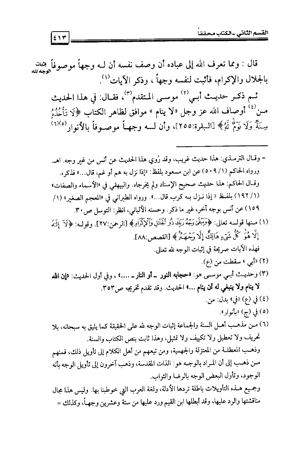 ثم ذكر حديث أبي موسى المتقدم، فقال: في هذا الحديث من أوصاف الله عز وجل «لا ينام» موافق لظاهر الكتاب {لاَ تَأْخُذُهُ سِنَةٌ وَلاَ نَوْمٌ} [البقرة:255] ، وأن له وجهًا موصوفًا بالأنوار