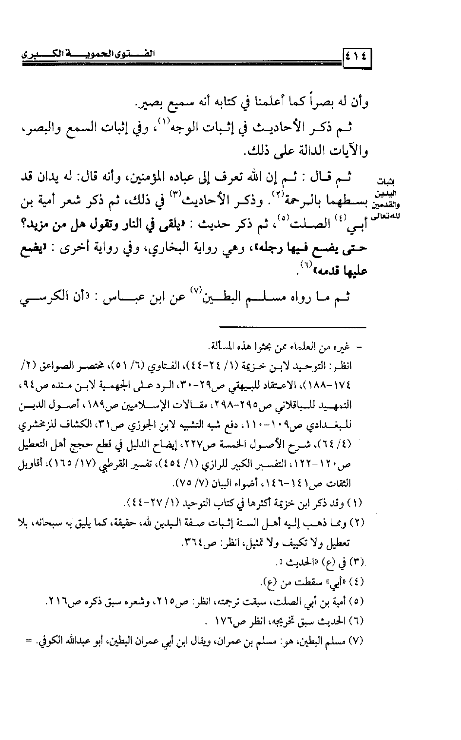 ثم قال: ثم إن الله تعرف إلى عباده المؤمنين، وأنه قال: له يدان قد بسطهما بالرحمة، وذكر الأحاديث في ذلك، ثم ذكر شعر أمية بن أبي الصلت، ثم ذكر حديث: «يلقى في النار وتقول هل من مزيد؟ حتى يضع فيها رجله» ، وهي رواية البخاري، وفي رواية أخرى: «يضع عليها قدمه» .