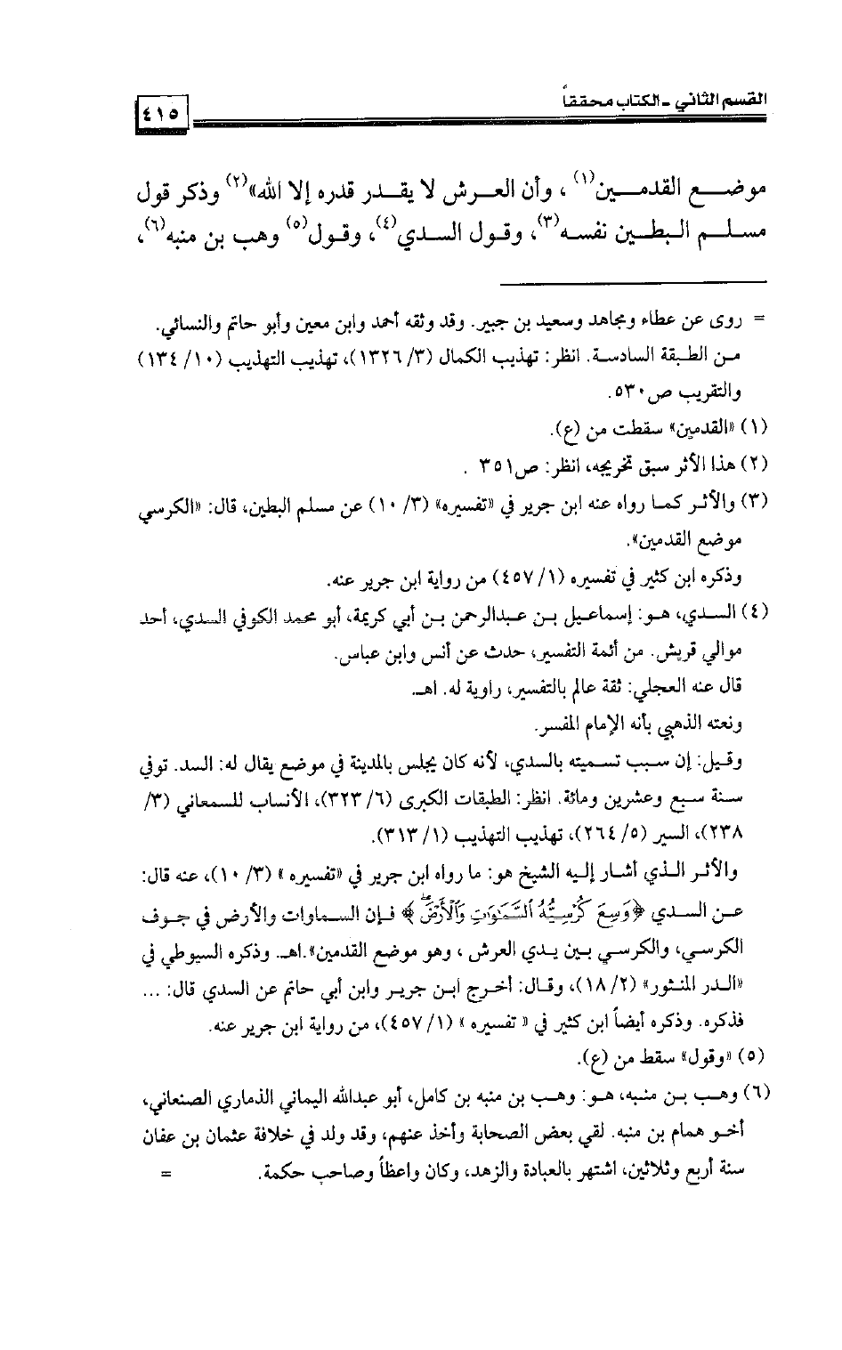 موضع القدمين، وأن العرش لا يقدر قدره إلا الله» وذكر قول مسلم البطين نفسه، وقول السدي، وقول وهب بن منبه،