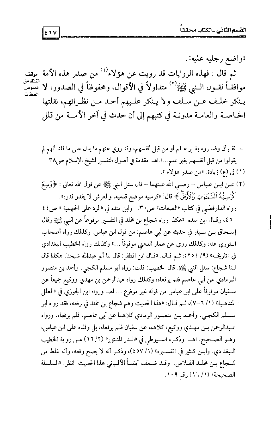 ثم قال: فهذه الروايات قد رويت عن هؤلاء من صدر هذه الأمة موافقًا لقول النبي صلى الله عليه وسلم متداولاً في الأقوال، ومحفوظًا في الصدور، لا ينكر خلف عن سلف ولا ينكر عليهم أحد من نظرائهم، نقلتها الخاصة والعامة مدونة في كتبهم إلى أن حدث في آخر الأمة من قلل