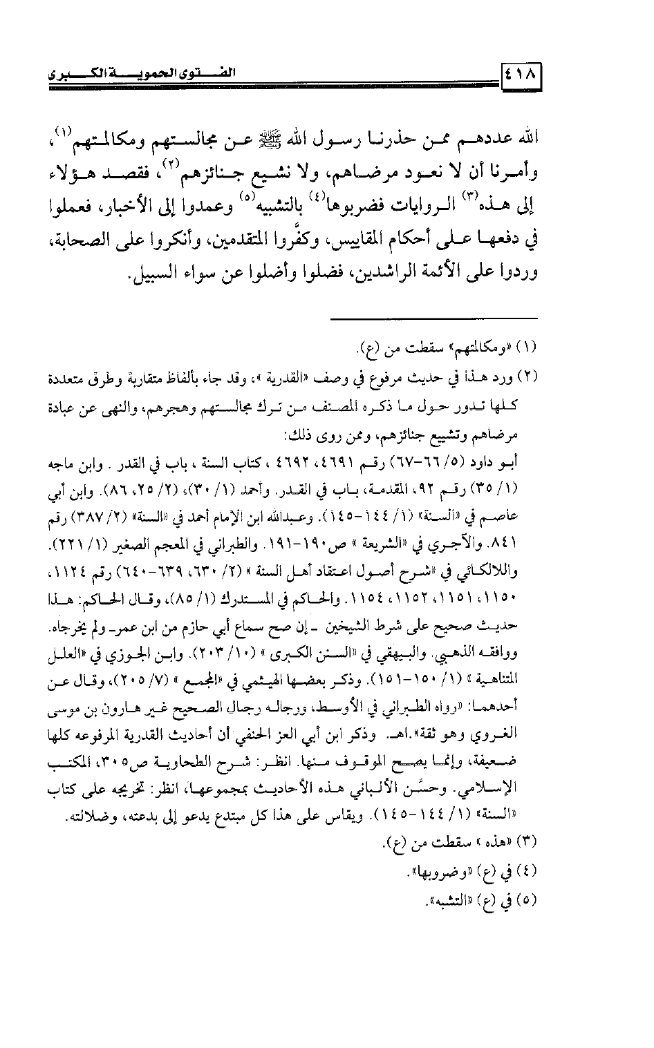 الله عددهم ممن حذرنا رسول الله صلى الله عليه وسلم عن مجالستهم ومكالمتهم، وأمرنا ألا نعود مرضاهم، ولا نشيع جنائزهم، فقصد هؤلاء إلى هذه الروايات فضربوها بالتشبيه وعمدوا إلى الأخبار، فعملوا في دفعها على أحكام المقاييس، وكفَّروا المتقدمين، وأنكروا على الصحابة، وردوا على الأئمة الراشدين، فضلوا وأضلوا عن سواء السبيل.