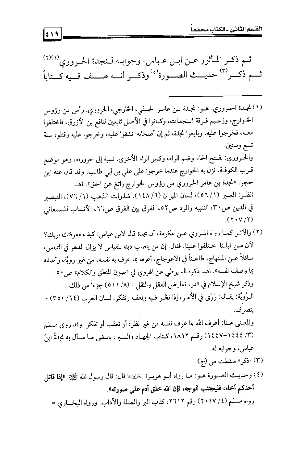 ثم ذكر المأثور عن ابن عباس، وجوابه لنجدة الحروري ثم ذكر حديث الصورة وذكر أنه صنف فيه كتابًا