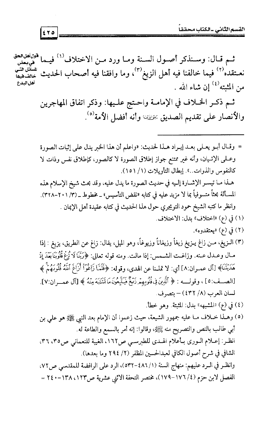 ثم قال: وسنذكر أصول السنة وما ورد من الاختلاف فيما نعتقده فيما خالفنا فيه أهل الزيغ، وما وافقنا فيه أصحاب الحديث من المثبتة إن شاء الله.