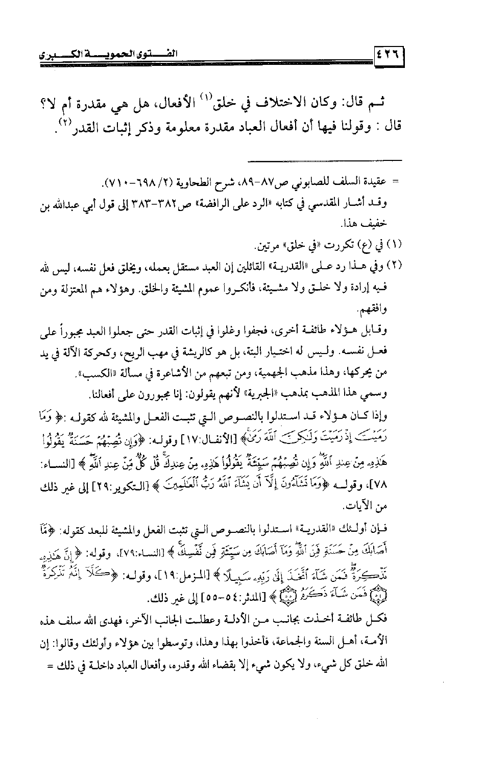 ثم قال: وكان الاختلاف في خلق الأفعال، هل هي مقدرة أم لا؟ قال: وقولنا فيها أن أفعال العباد مقدرة معلومة وذكر إثبات القدر.