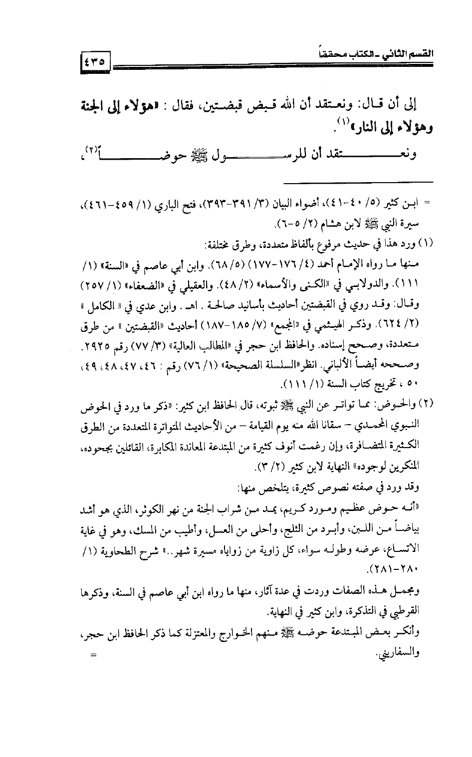 إلى أن قال: ونعتقد أن الله قبض قبضتين فقال: «هؤلاء إلى الجنة وهؤلاء إلى النار» .