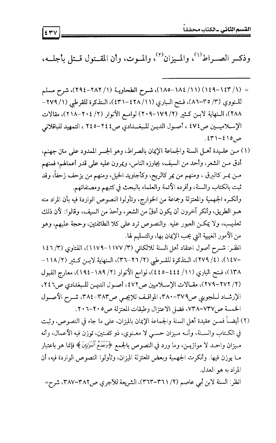 وذكر الصراط، والميزان، والموت، وأن المقتول قتل بأجله،