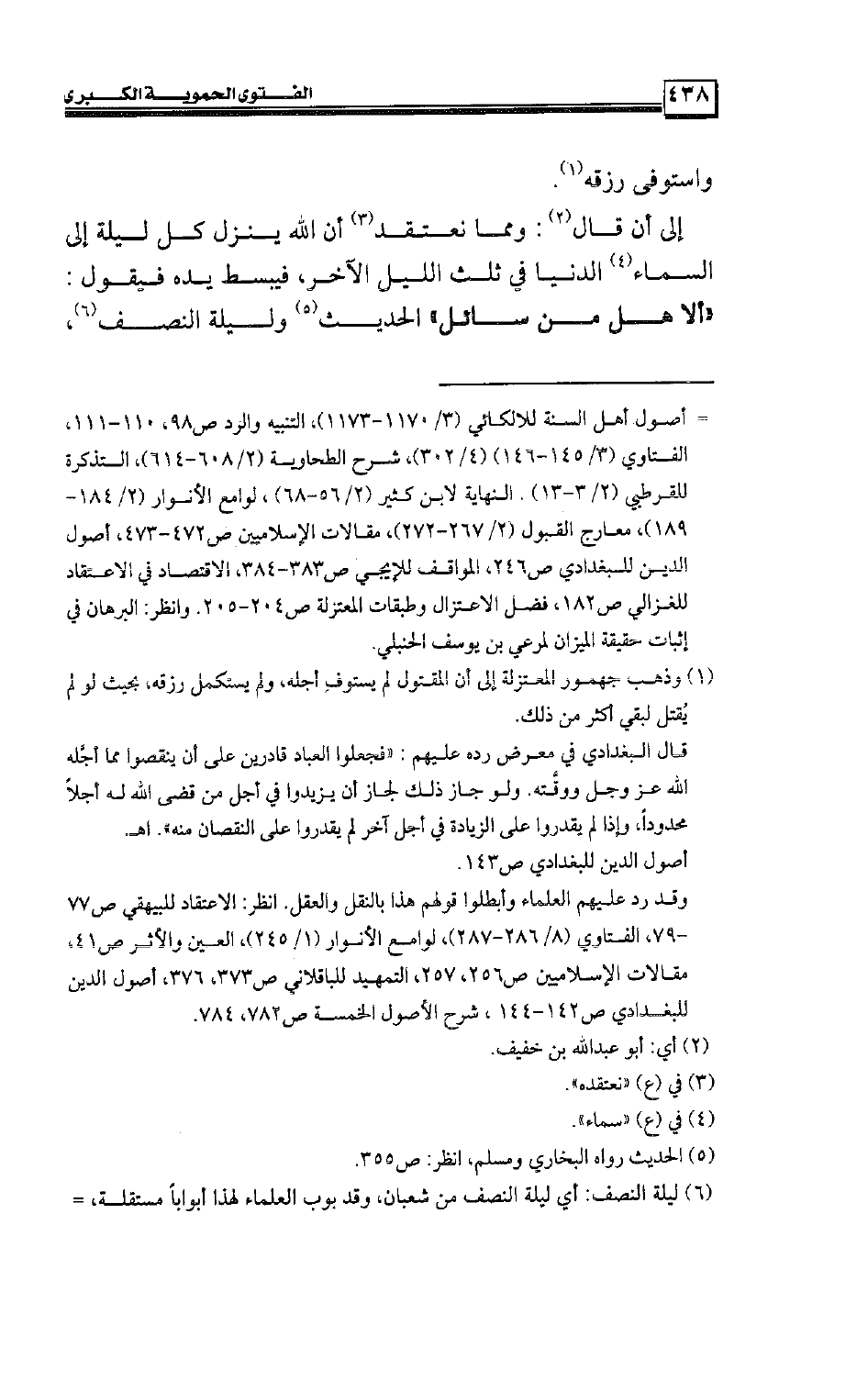 إلى أن قال: ومما نعتقد أن الله ينزل كل ليلة إلى السماء الدنيا في ثلث الليل الآخر، فيبسط يده فيقول: «ألا هل من سائل» الحديث وليلة النصف،