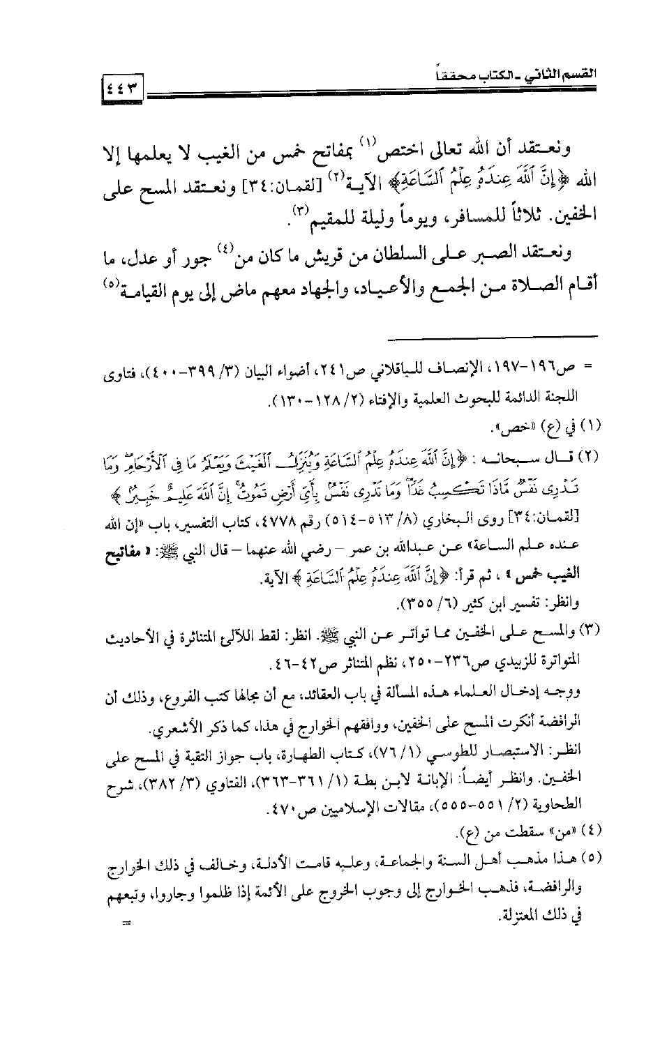 ونعتقد أن الله تعالى اختص بمفتاح خمس من الغيب لا يعلمها إلا الله {إِنَّ اللَّهَ عِندَهُ عِلْمُ السَّاعَةِ} الآية [لقمان:43] ونعتقد المسح على الخفين. ثلاثًا للمسافر، ويومًا وليلة للمقيم.