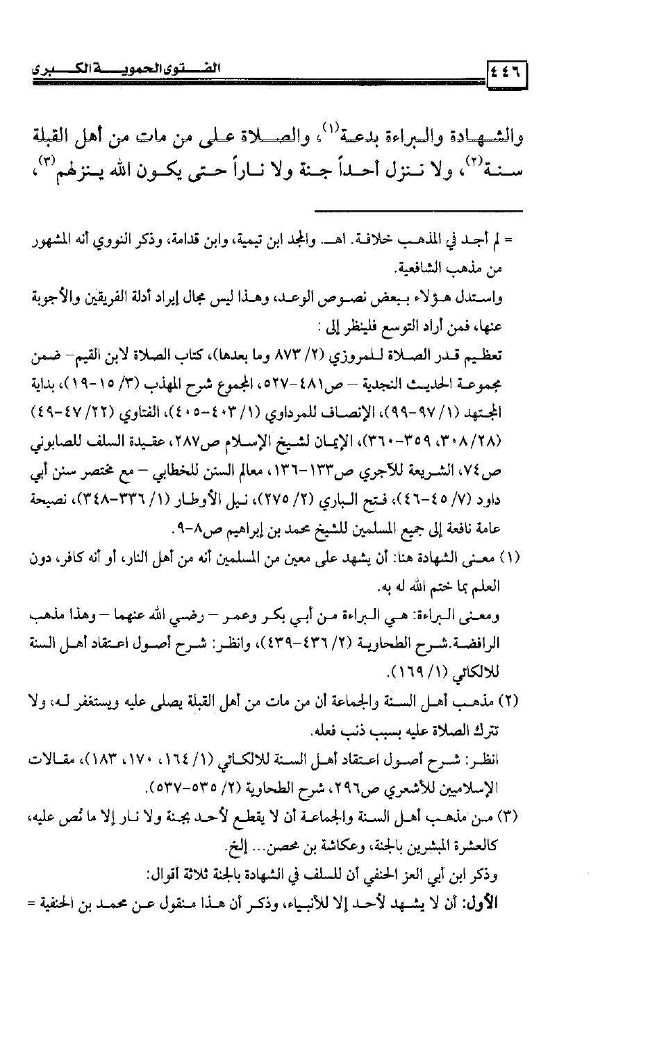 والشهادة والبراءة بدعة، والصلاة على من مات من أهل القبلة سنة، ولا ننزل أحدًا جنة ولا نارًا حتى يكون الله ينزلهم،