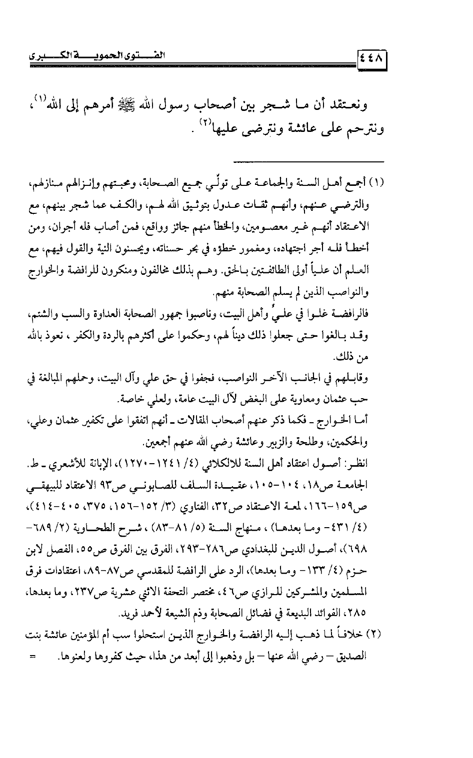 ونعتقد أن ما شجر بين أصحاب رسول الله صلى الله عليه وسلم أمرهم إلى الله، ونترحم على عائشة ونترضى عليها.
